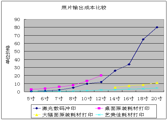 從上圖就可以看出,照片打印機(jī)和基于照片打印的多功能打印機(jī),每年都以30%以上的速度增長(zhǎng),僅美國(guó)市場(chǎng),2005年預(yù)計(jì)裝機(jī)量就達(dá)到2000萬臺(tái)以上,2008年可達(dá)3000多萬臺(tái)。 相比于數(shù)碼激光,照片的噴墨打印輸出至少有如下優(yōu)勢(shì):方便、隨意性強(qiáng):因?yàn)橥耆诩彝?、辦公室實(shí)現(xiàn),可大可小、可多可少,隨時(shí)隨地、隨心所欲。私密性好:用不著將數(shù)碼文件交給別人,也用不著從他人處取回,不想讓人見的,別人永遠(yuǎn)見不到。DIY,樂趣無窮:不管是對(duì)于專業(yè)人士,還是對(duì)于數(shù)碼發(fā)燒友,完全可以陶醉于從拍照、編輯修改到打印輸出的無窮樂趣。環(huán)保:不再用銀鹽等稀缺資源,也擺脫了藥水使用與排放對(duì)于環(huán)境的污染。持久不退色:噴墨打印墨水分為染料和顏料兩大類,如果使用顏料墨水打印出的照片,比傳統(tǒng)的銀鹽感光照片能夠保存更長(zhǎng)的時(shí)間而不退色。 噴墨打印技術(shù)不斷發(fā)展,墨水和打印介質(zhì)品質(zhì)也在不斷提高,從技術(shù)的角度來看,水性顏料墨水+RC間隙型防水高光相紙是照片噴墨的主流方向。不但質(zhì)感、影像品質(zhì)方面毫不遜色于銀鹽感光照片,而且在光線耐牢度、方便性、設(shè)備投入等方面明顯優(yōu)于感光照片。 可能唯一的問題是成本,有的人會(huì)抱怨,噴墨打印的成本高,是的,以EPSON照片級(jí)噴墨打印機(jī),打印在原裝EPSON高質(zhì)量光澤照片紙上為例,打印一張6寸的照片,成本會(huì)在3元以上,而在外面的沖印店里,激光數(shù)碼沖印的報(bào)價(jià)只有一塊左右。定位于專業(yè)應(yīng)用的大幅面打印機(jī)打?。?4英寸到44英寸寬)成本會(huì)低很多,因?yàn)樽烂娲蛴C(jī)墨盒中的墨水,平均每毫升價(jià)值10塊人民幣左右,大幅面打印機(jī)墨盒的容量更大,平均每毫升2元上下。從下圖就可以看出,用專業(yè)大幅面打印機(jī)打印照片,成本就已經(jīng)遠(yuǎn)遠(yuǎn)低于激光數(shù)碼沖印的價(jià)格,但是這些打印機(jī)并不是給家庭使用的,像激光數(shù)碼沖印一樣,是給專業(yè)的影像服務(wù)機(jī)構(gòu)使用的。